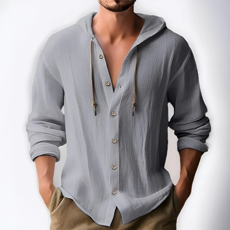 メンズフード付きTシャツ、無地、コットンリネン、メンズカジュアル長袖トップス